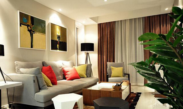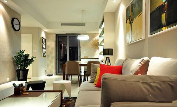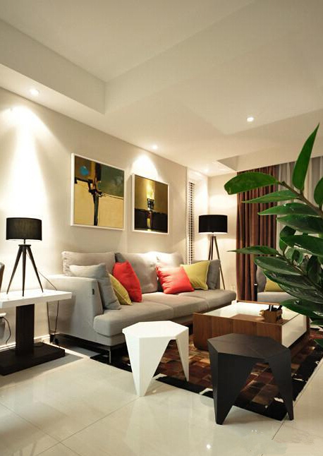 沙發墻上的兩幅現代畫,很巧妙的點綴了客廳的氣氛,也凸顯出主人不錯的品味。黑白兩個小凳子也獨具個性。